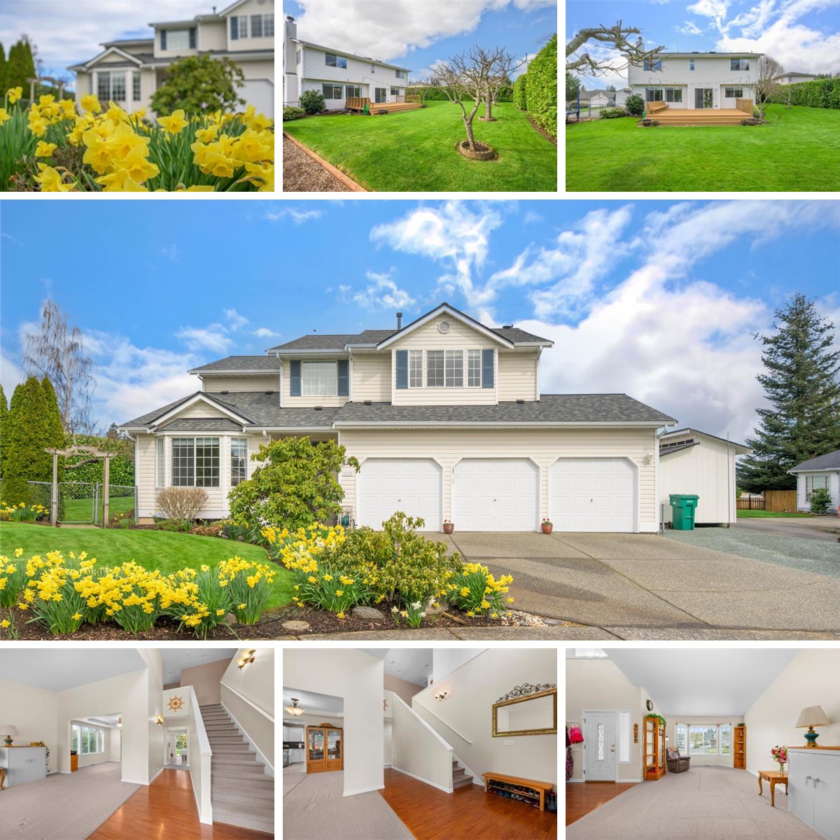 Nestled on a spacious lot backed by a lush greenbelt, this well-maintained home welcomes you with vibrant flower beds and classic curb appeal. Inside, you'll find generously sized rooms on both the main and upper levels, filled with natural light. The kitchen and family room flow seamlessly to a large deck overlooking a peaceful, fully fenced backyard with mature fruit trees. Recent updates include a newer roof, furnace, and tankless water heater. The expansive primary suite offers views of Fidalgo Bay. Additional highlights include a heated 3-car garage with built-ins, RV/boat parking, a formal mud room, and a custom shed. All just a short stroll to local schools, the community pool, scenic hiking trails, and more!