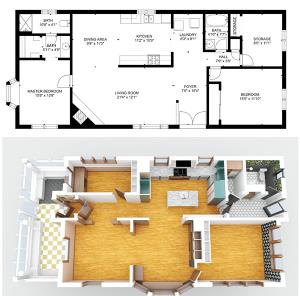CAD style floorplan layouts. Available in a standard 2-D black and white drawing, or a more immersive 3-D colored version.
